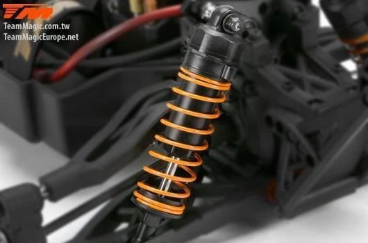 | At Team Magic, we did not want to make a Monster Truck for a small child so we made the E5 for the big child! We started with the idea to do an 8th scale Monster Truck, but smaller, and to create the E5. We combined the durability and power of an 8th scale Monster Truck with the agility, speed and fast handling of a 10th scale. We also added some nice new features. The E5 is currently the fastest and strongest 1:10 scale Monster Truck on the market. The front bumper is also equipped with three white and two red bright LEDs. The Team Magic E5 includes a strong, well-shaped pick-up Monster Truck polycarbonate body to protect the internal components. Durable 14mm wheel hexes help handle the high power transfer towards the high-traction compound K-Factory tires which offer additional performance and fast acceleration on every surface. We also added an adjustable and durable ball-raced wheelie bar on the rear to give highest control and support wheelie’s. You’ll like it! All plastic chassis components are of high-quality fibre material which offers highest durability as well as less tweak for better geometry and better transmission efficiency. The Team Magic E5 chassis has an easy multi-port plug which let you change electronics easier. Less cables in the car thanks to cable tunnels. Quick release battery straps hold your 2- or 3-cell batteries in place. The all-new dust/dirt filter on the THOR speed control protect the fan from water and dust. We used the best electronic components we could find in the market! A 15kg waterproof metal gear blue Savöx servo gives you steering precision in any situation. See the waterproof receiver in the waterproof receiver box. The 80Amp THOR speed control and 4400kv 550 sized THOR motor make the Team Magic E5 a real rocket. To handle that high power level and do the E5 again more durable we used 8th scale module 1.0 steel transmission as well as 5mm motor shaft. Drive a rocket – choose the Team Magic E5! – Lenght 428mm |